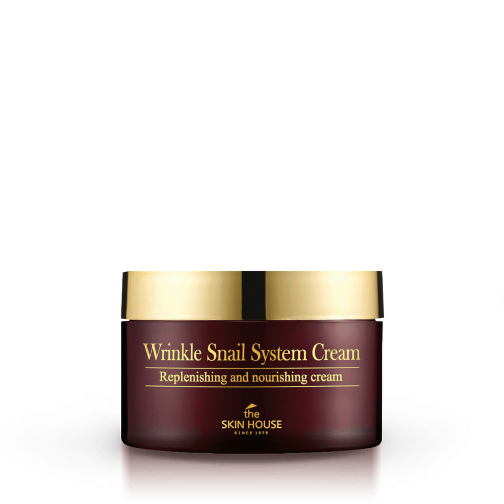 The Skin House Wrinkle Snail System Cream 50 ml es una crema facial coreana antiarrugas formulada con mucina de caracol, adenosina y aloe vera. Ayuda a mantener la piel hidratada y a mejorar la apariencia de elasticidad, como parte de una rutina de cuidado antiage.